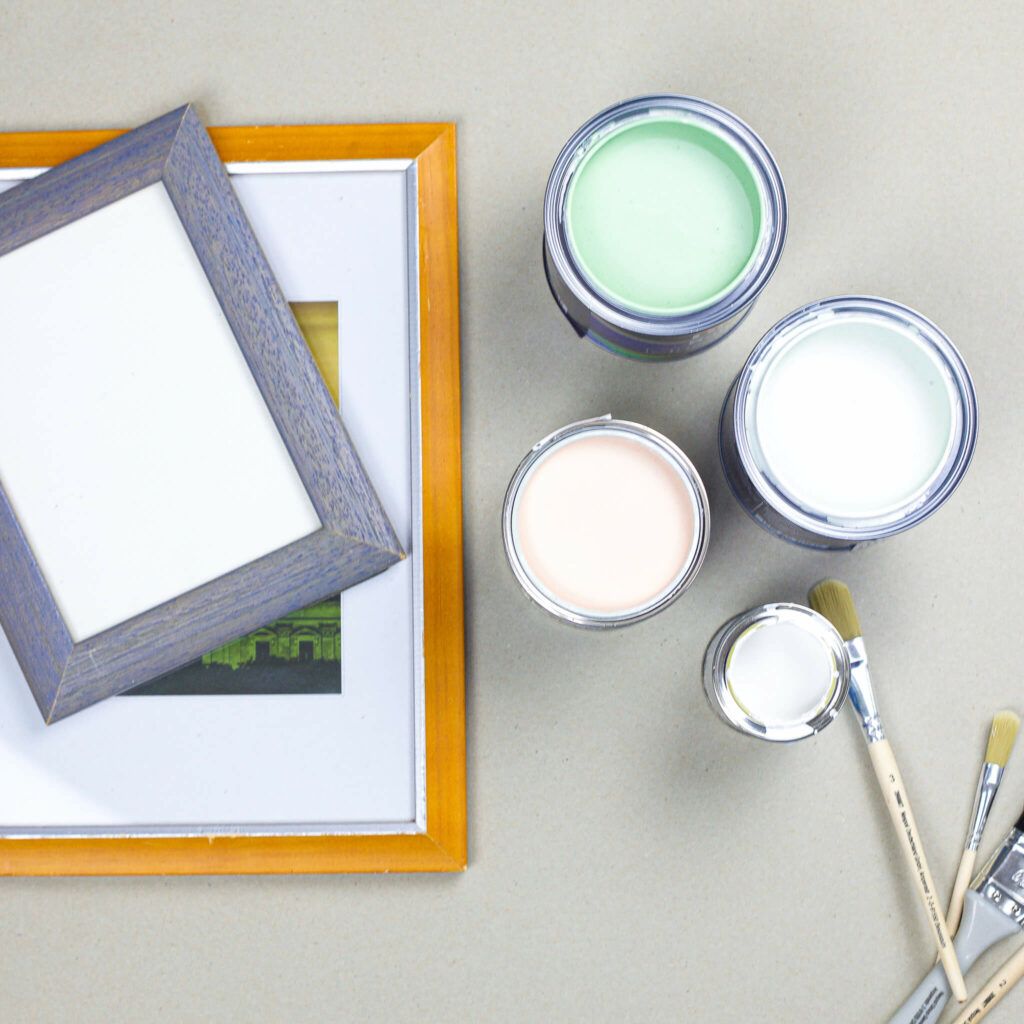 Alle Bilderrahmen sind fertig bemalt. Der kleine hat sogar einen zweifarbigen Anstrich bekommen. Dafür einfach den Bilderrahmen einmal mit der helleren Farbe komplett anstreichen und trocknen lassen. Dann mittig mit einem Kreppband ankleben und den unteren oder oberen Teil mit der anderen Farbe streichen.