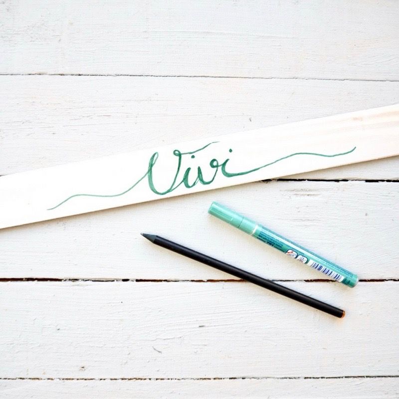 Als nächstes erfolgt der Anstrich. Ich habe ein Dekorwachs gewählt, welches für den Hund ungefährlich, aber trotzdem pflegeleicht ist. Denn sicher wird das eine oder andere Mal etwas daneben gehen. Das Dekorwachs trägt transparent weiß auf, ist abwaschbar, aber für Mensch, Tier und Pflanzen unbedenklich. Das war mir sehr wichtig. Es dauert mindestens einen Tag, bis alles komplett trocken ist. Aus dem flachen Reststück einer Holzleiste (hier 51 x 4 cm) habe ich für Vivi die Hundebar gleich noch personalisiert, damit auch der Kater Bescheid weiß… Die Leiste wird ebenso mit dem Dekorwachs gestrichen und nach dem Trocknen mit einem Lackmarker verziert.