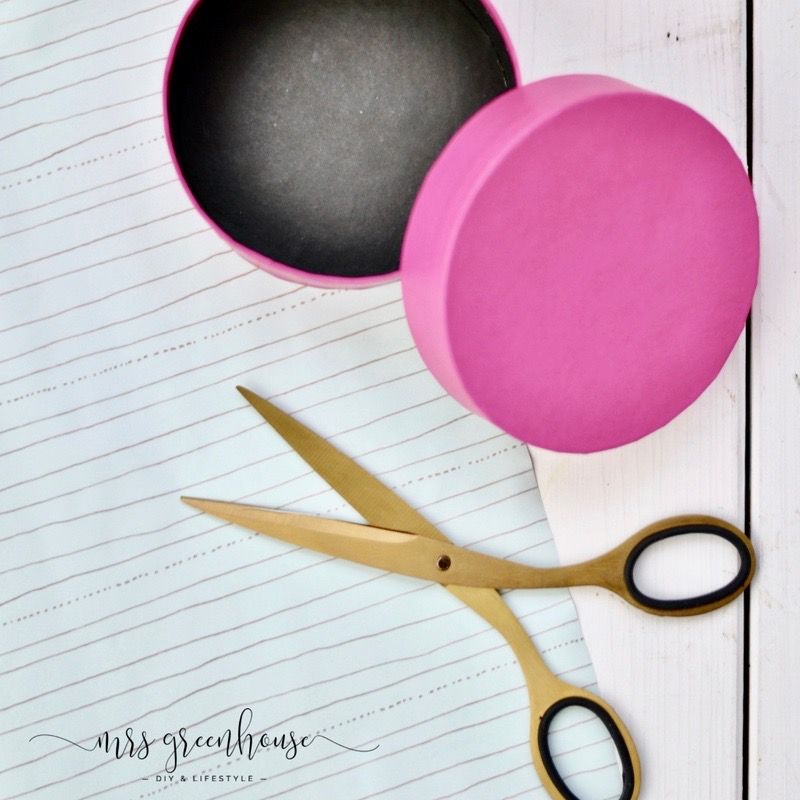 Schneidet passend zur Deckelgrösse und dem Umfang der Seiten aus der Dekorfolie entsprechende Stücken zu. Bei allen Teilen habe ich ca. 1 cm dazugegeben, damit sich die Ränder umlegen lassen. An den runden Stellen schneidet ihr die Kanten ein wenig ein, damit sich keine Falten bilden. Fangt zuerst mit dem oberen runden Deckelteil an. Klebt danach erst das Seitenteil an. Aus dem Kupferdraht schneidet ihr ein beliebiges langes Stück und stecht die Enden durch kleine Papierherzen. Verzwirbelt die Enden und bindet den Draht zum Schluss an die Schleife.
