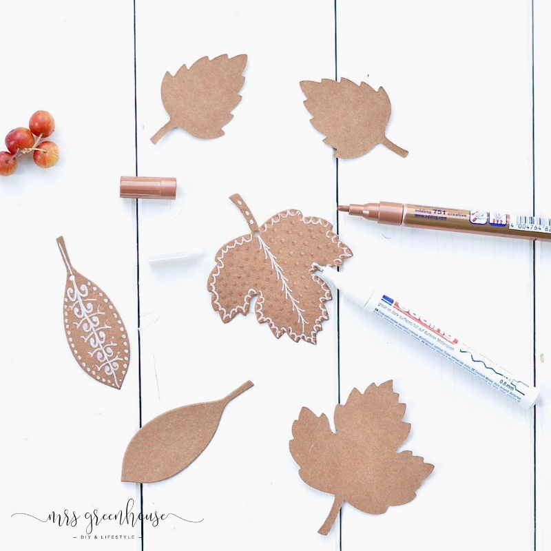 Verziert die Blätter mit den Lackstiften die Blätter ganz nach eurem Geschmack. Auch Mandalas, wie auf diesen Steinen, lassen sich so schön darauf zeichnen. Mit Gold- oder Kupferstiften lassen sich hübsche Akzente setzen. Seht ihr die kleinen Punkte auf dem Ahornblatt? Die Herbstblätter könnt ihr wunderbar auf dem gedeckten Tisch verstreuen. Für die Gäste bindet ihr ein hübsch verziertes Blatt mit einem kleinen Waldfund an die Serviette. Jetzt braucht ihr nur noch einen leckeren Kuchen, ein paar Kerzen und schon ist die gemütliche Herbsttafel gedeckt. Wie wäre es mit leckeren Apple Pie’s oder einer Birne Helene im Blätterteig?