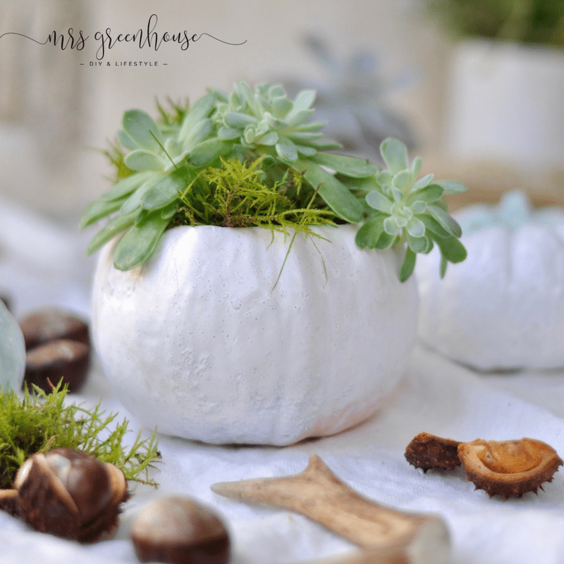 Der Herbsttisch wird dieses Jahr mit einem Sukkulentengarten in Minikürbissen dekoriert…..