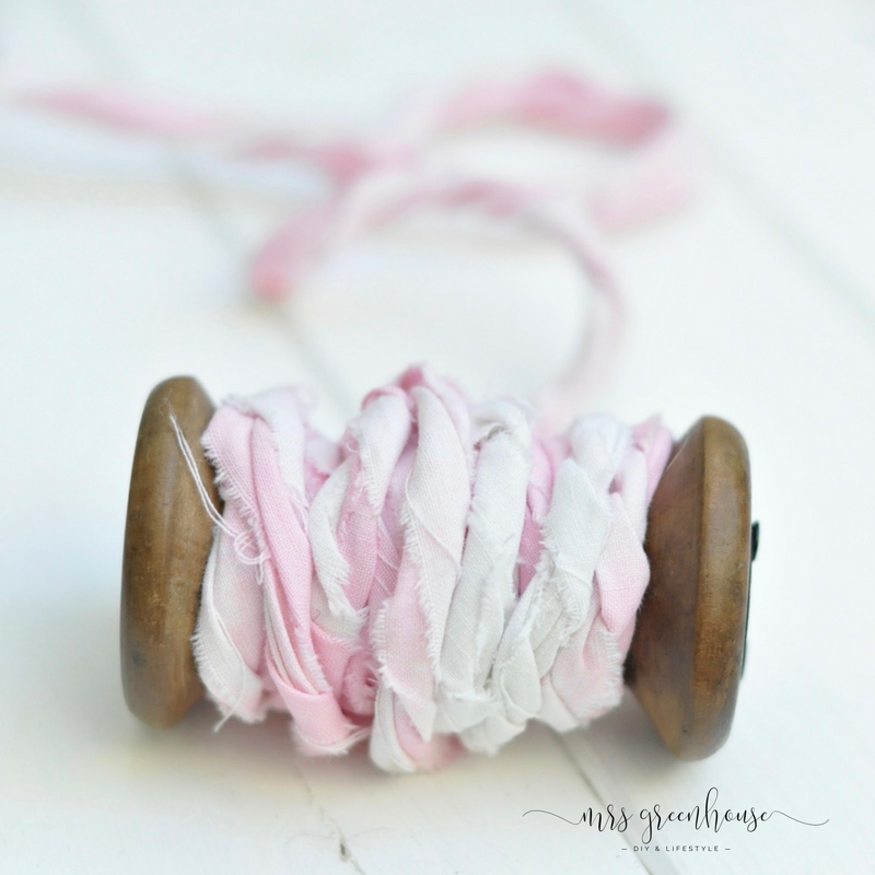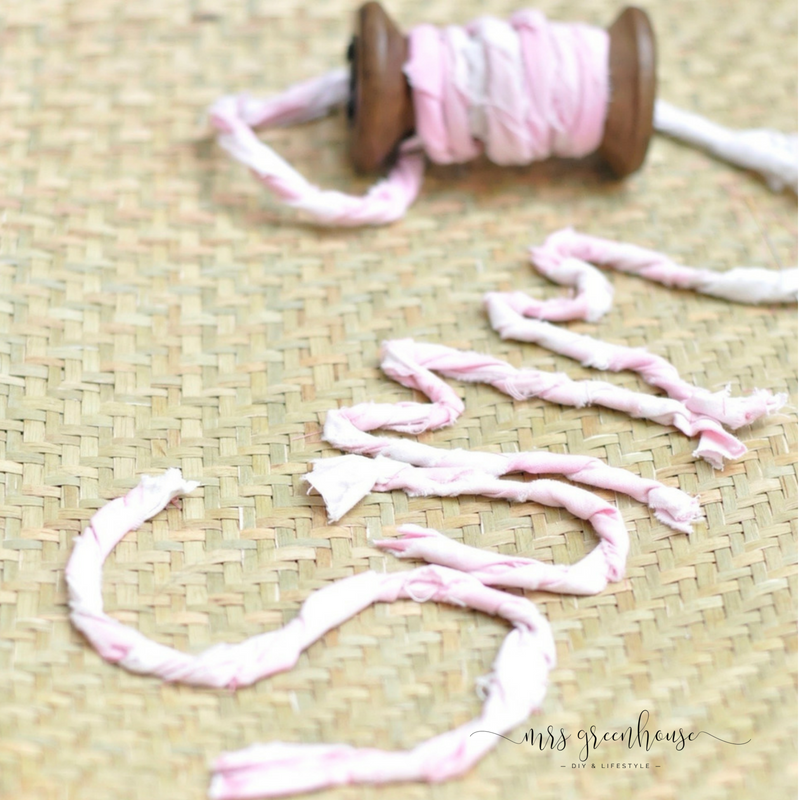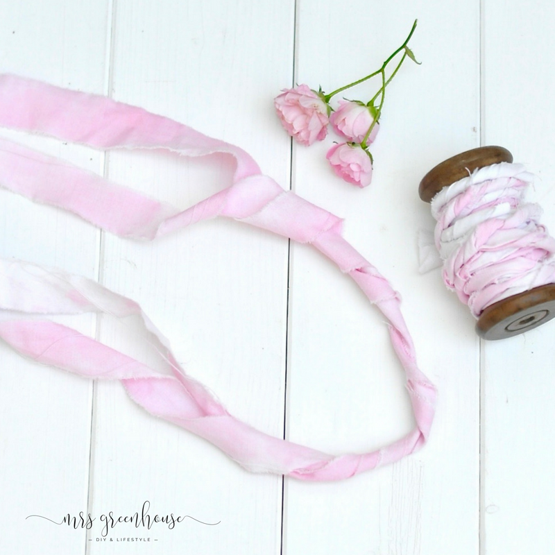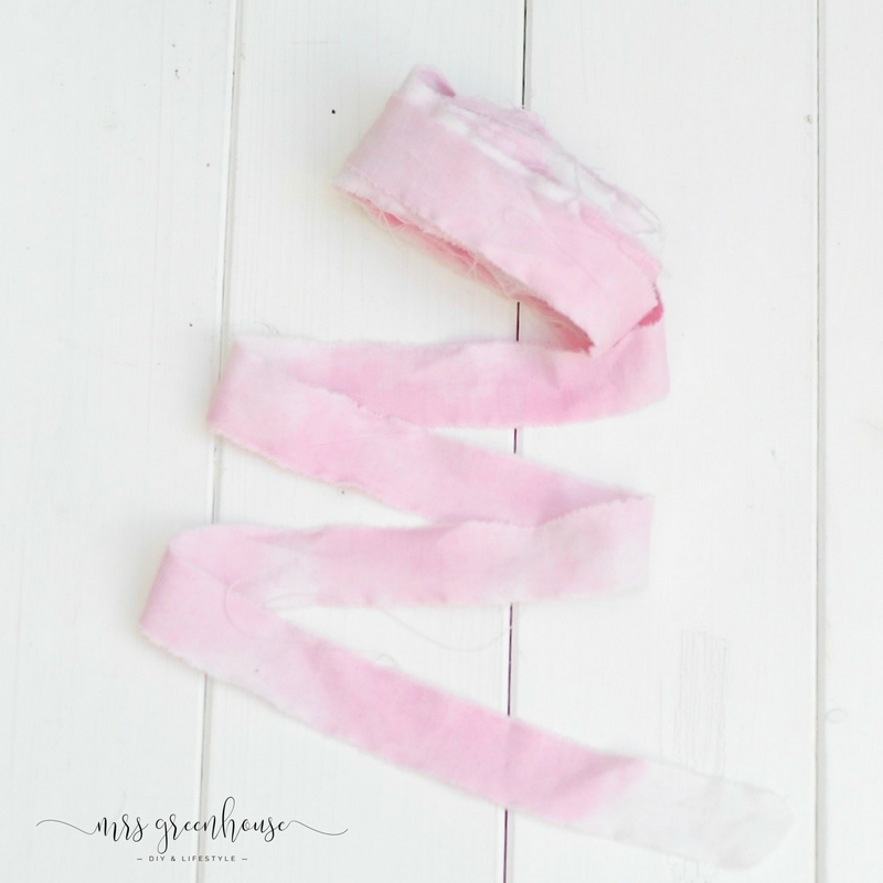 Zuerst müssen die Garnstreifen vorbereitet werden. Ich habe den Stoff vorher mit rosa Textilfarbe besprüht. Dafür wir die Farbe mit Wasser angemischt und in eine Sprühflasche gefüllt. Durch das partielle Aufsprühen ist dieser tolle Effekt entstanden. Der Stoff wirkt wie marmoriert. Es sieht bestimmt auch Klasse aus, wenn man zwei verschiedene Farben kombiniert. Seid kreativ und lasst eurer Phantasie freien Lauf!