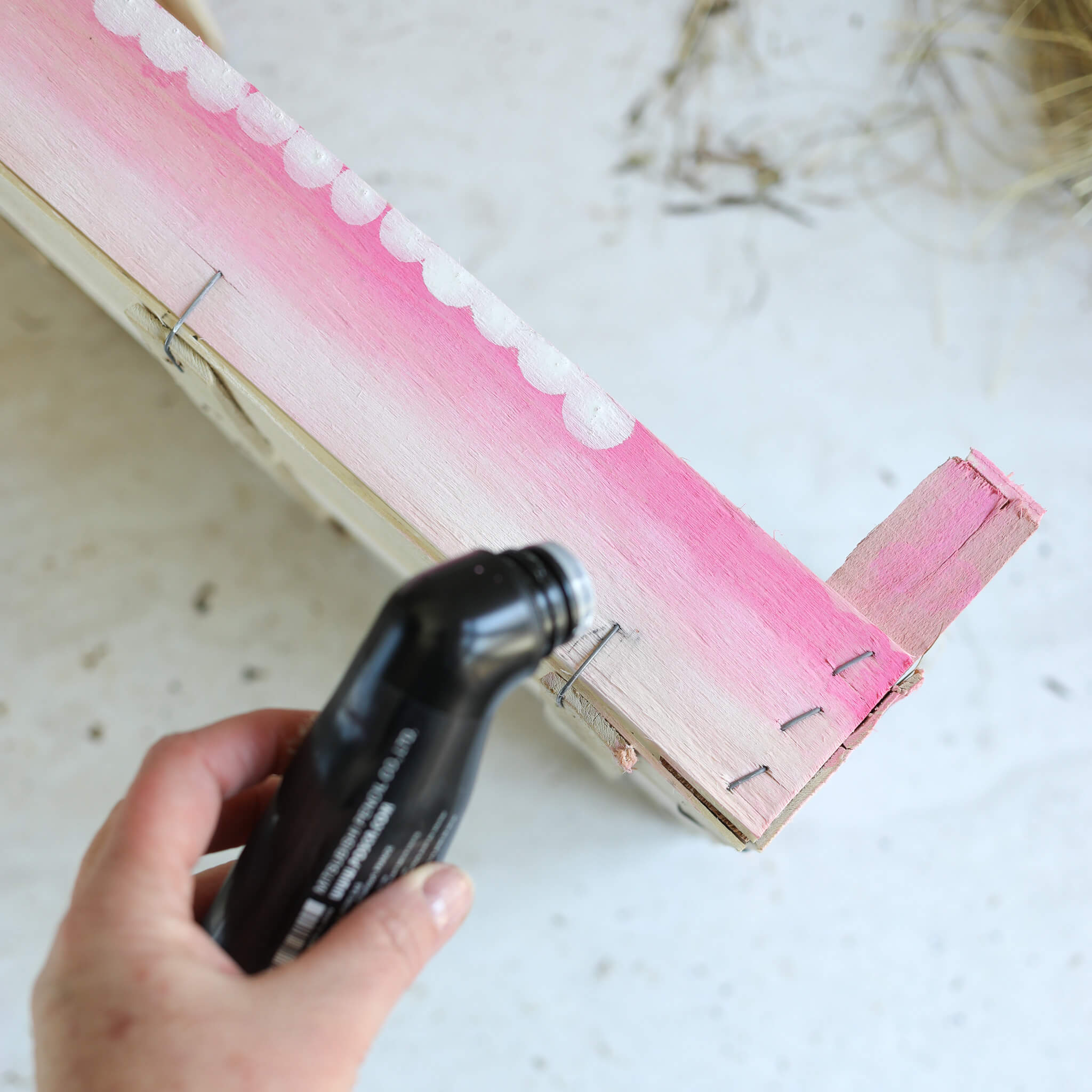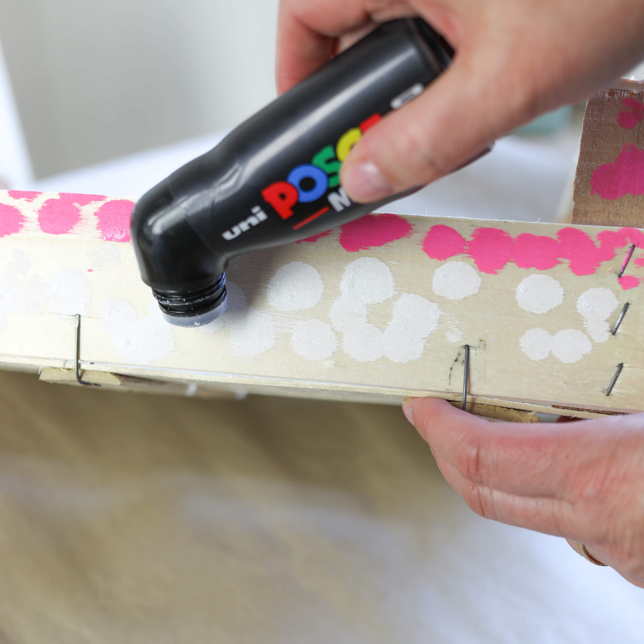 Zuerst habe ich mich um die Obstkiste gekümmert. Ich wollte eine frische, frühlingshafte Optik und habe mich deshalb für einen Farbverlauf in Pink und Weiß entschieden. Dafür habe ich den POSCA MOP’R verwendet. Dieser Marker ist perfekt, wenn man größere Flächen bemalen möchte oder einen weichen Farbverlauf erzeugen will.