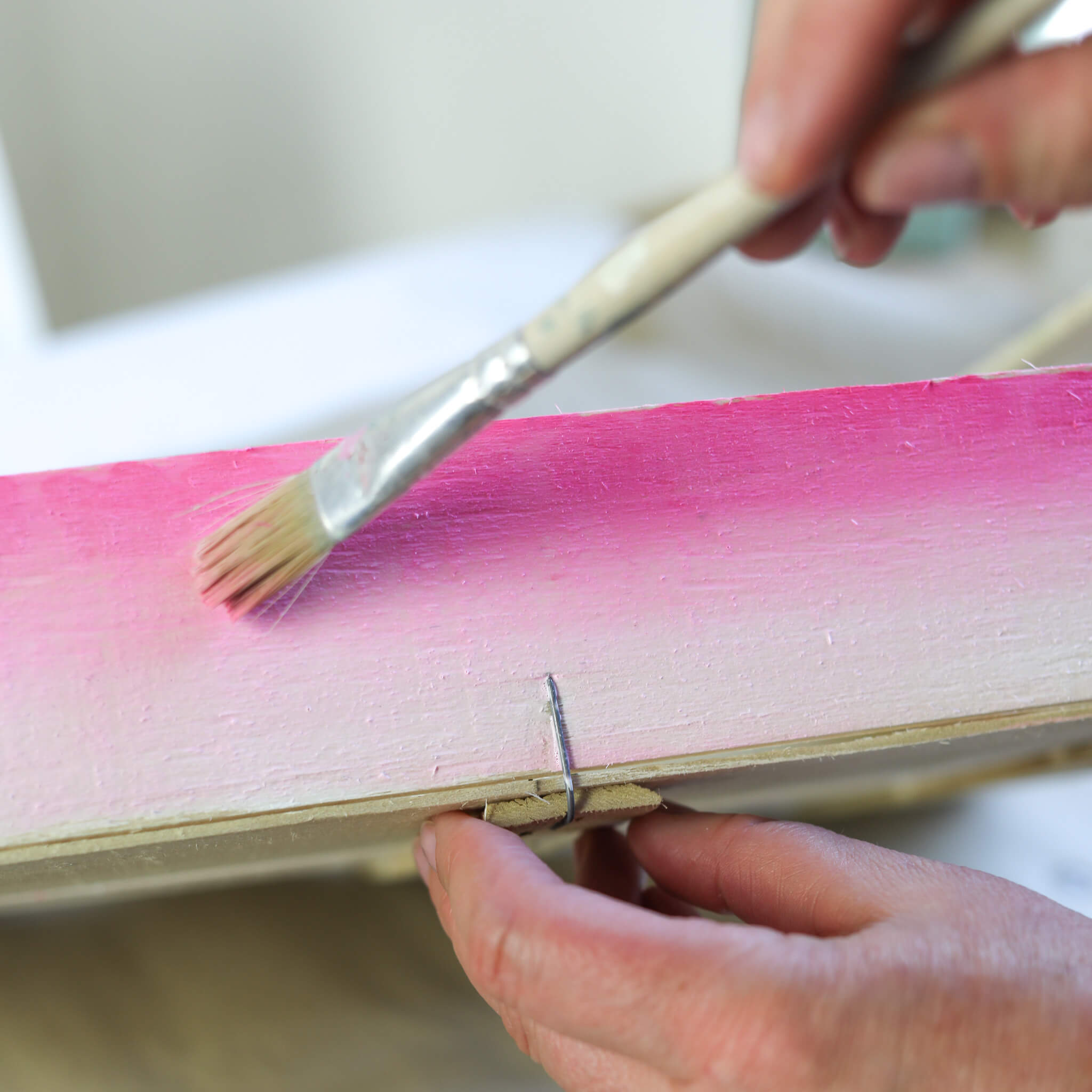 Zunächst habe ich im oberen Bereich der Kiste das Pink aufgetragen und dann nach unten mit Weiß weitergearbeitet. Solange die Farbe noch feucht ist, lässt sich sich einfach verblenden. Da die Oberfläche der Holzkiste recht rau ist, habe ich hierzu einen Pinsel und ein bisschen Wasser zur Hilfe genommen. Hier solltet ihr auch recht schnell arbeiten, da die raue Oberfläche die Farbe schnell aufnimmt. Entstanden ist hier ein schöner sanfter Farbeffekt, der ist wie gesprüht aussieht. Auf glatten Oberflächen könnt ihr auch einfach ausschließlich mit dem MOP’R arbeiten.