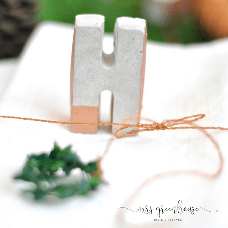 Die getrockneten Buchstaben habe ich anschließend mit Kupferlack bemalt. So erhalten die grauen Buchstaben ein bisschen Festtagsfarbe. Damit habe ich auch schon bei unseren Beton-Übertöpfen und der Vogeltränke gearbeitet.
